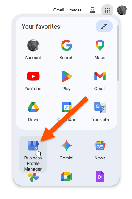 Click on the 9-Dot Application Menu in the upper right corner. Then, click on the Business Profile Manager Icon