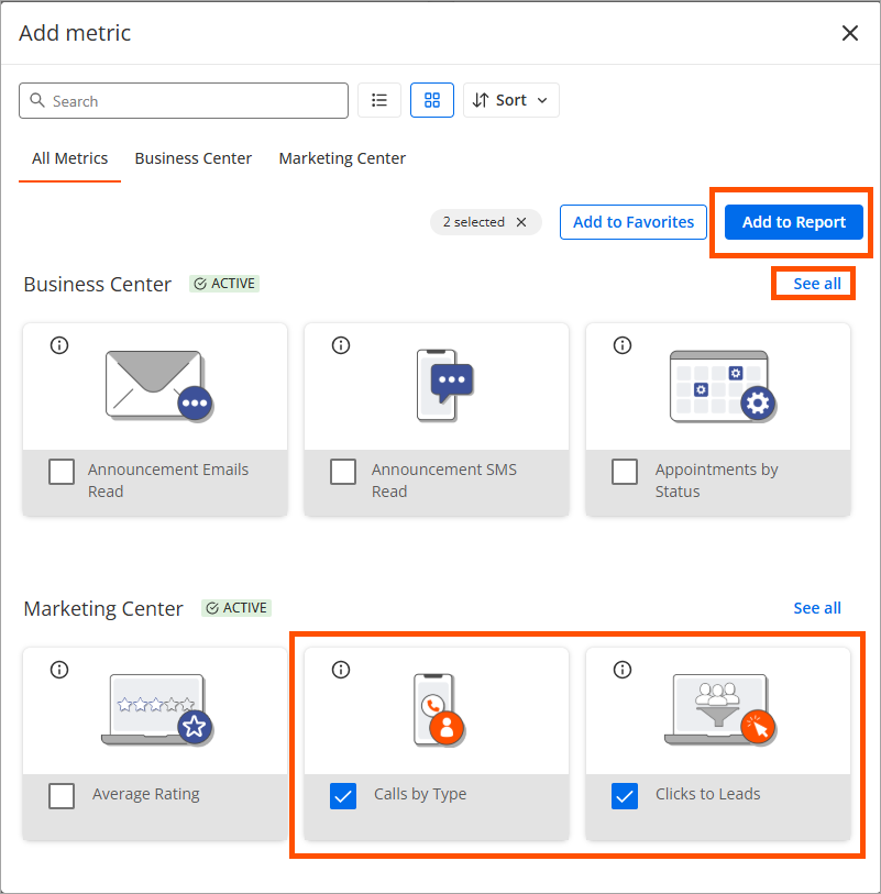 Click on the checkbox for a metric to add it to your report. Note that you can select multiple. When finished, click on Add to Report. Note that you can click on the See all link to view more metrics.