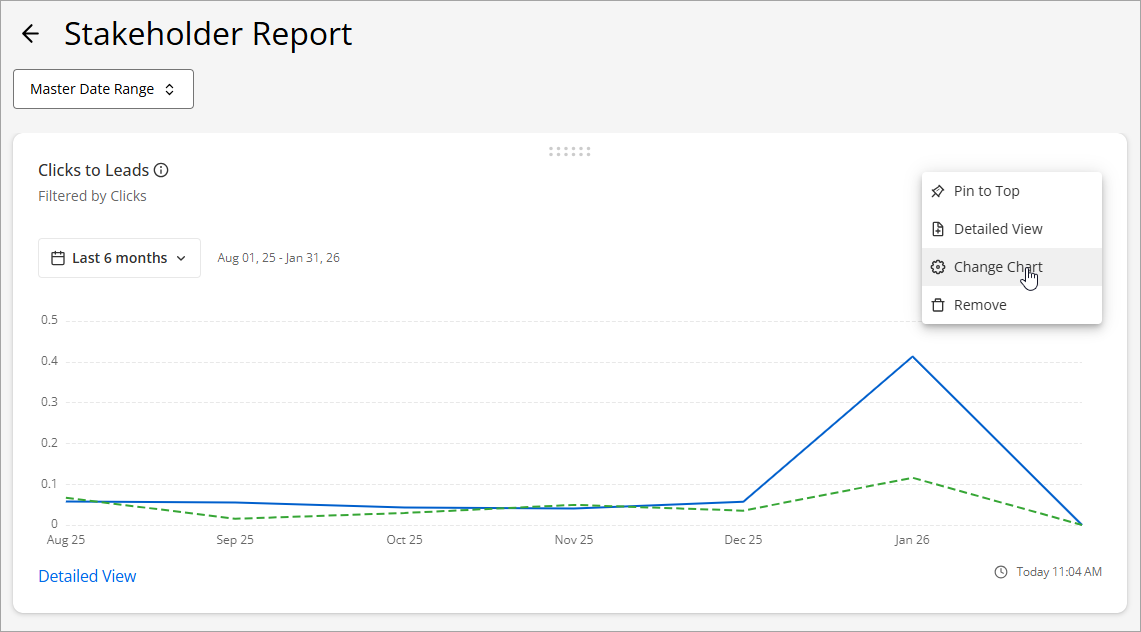 Customize how the metrics in your report are displayed. Use the drag and drop feature to rearrange the order of the metrics, or click the tri-dots to change the chart type. Additionally, use the master date range to change the date for all metrics at once, or adjust them individually