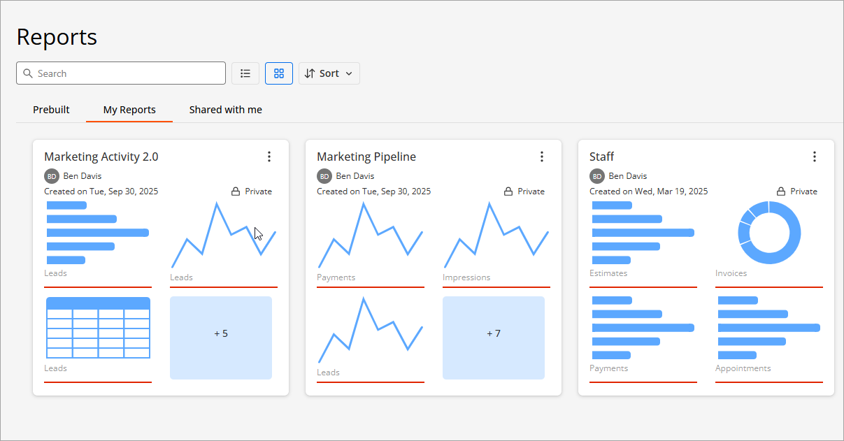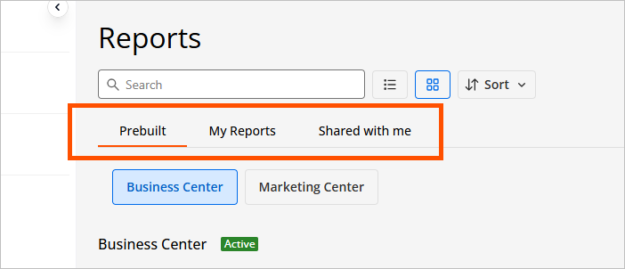 Use the tabs at the top to navigate through your prebuilt reports, custom reports (My Reports), and reports that have been shared with you.