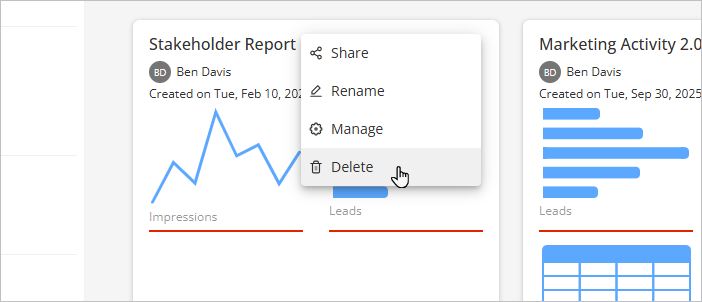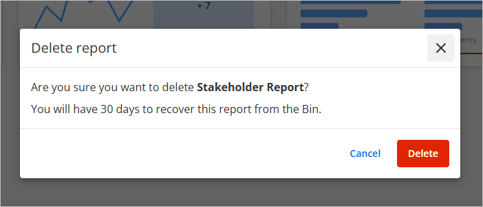 You will be asked to confirm. Note that deleting a report also removes access for everyone it is shared with, and any reminders set. It will remain in the bin for 30 days. Click Delete to confirm.