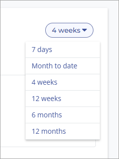 Use the date filter to change the date range for this data. Note that the solid line on the graph shows data for the period selected, while the dotted line shows data for the previous corresponding period. For example, if you have selected 4 weeks for the time range, the solid line will show the previous 4 weeks, while the dotted line will show the 4 weeks prior