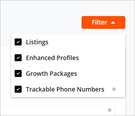 In addition, you can also filter by the type of exposure for your business, between your listings, Enhanced Profiles, Trackable Phone Numbers, and ads from your Growth Packages.