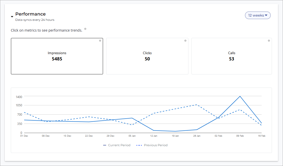 The Performance section will show data for your Enhanced Profiles and Growth Package. Click on the tile for a metric to display it on the graph. The available metrics are: