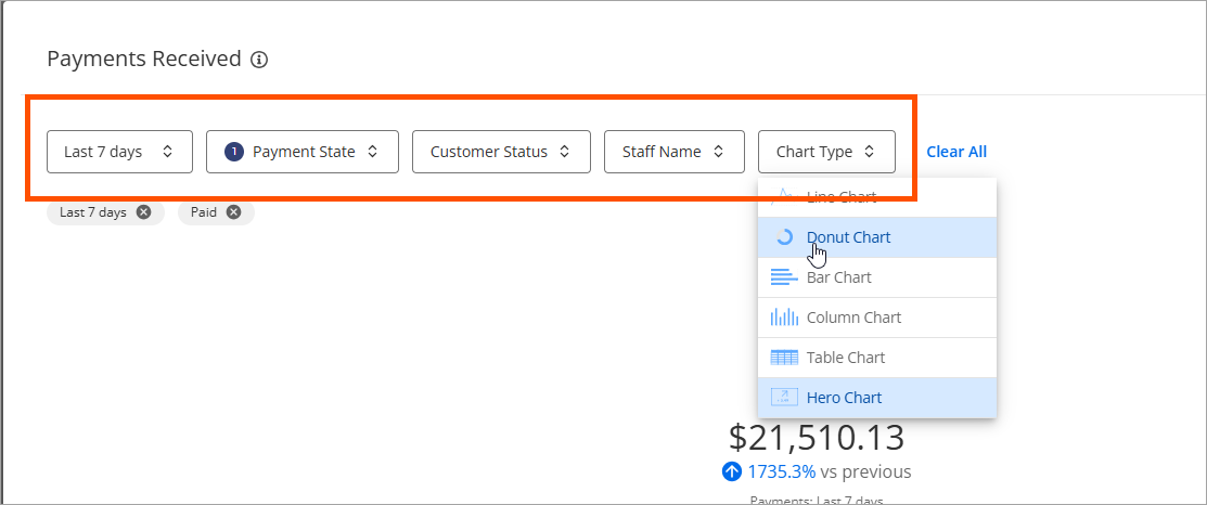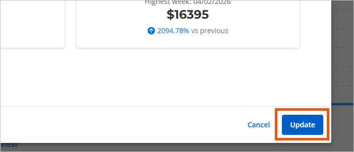 In the detailed view, you will see additional metrics below the chart including changes over time, average per week, and the highest week for this metric. From here, you are able to use the drop-downs across the top to apply filters, change the date range, or the chart type as on the main tile. To apply these changes to the report view, click on Update.