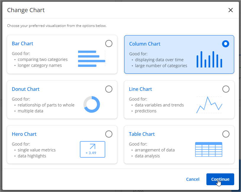 In the window that appears, select one new chart type to display the data. Then, click on Continue