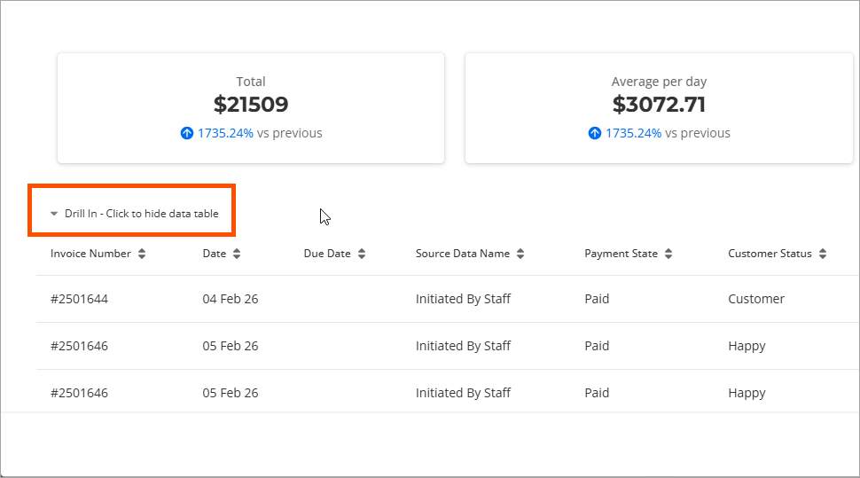 Scroll to the bottom of each metric tile on a report to drill in to the data. In this context, "Drill in" means to break down a number or metric to navigate from the high-level summary to the detailed records that comprise it. Click on the drill-in drop down to see each of the individual records contained in the metric. In addition, click on View client record to be taken to the individual client, invoice, appointment, etc in your Thryv CRM.