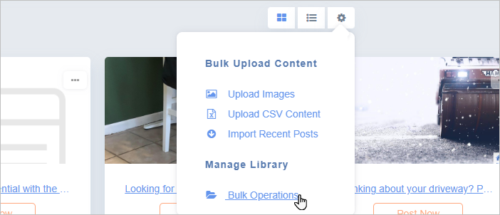 In the Content Library, hover over the gear icon in the center of your screen and choose Bulk Operations