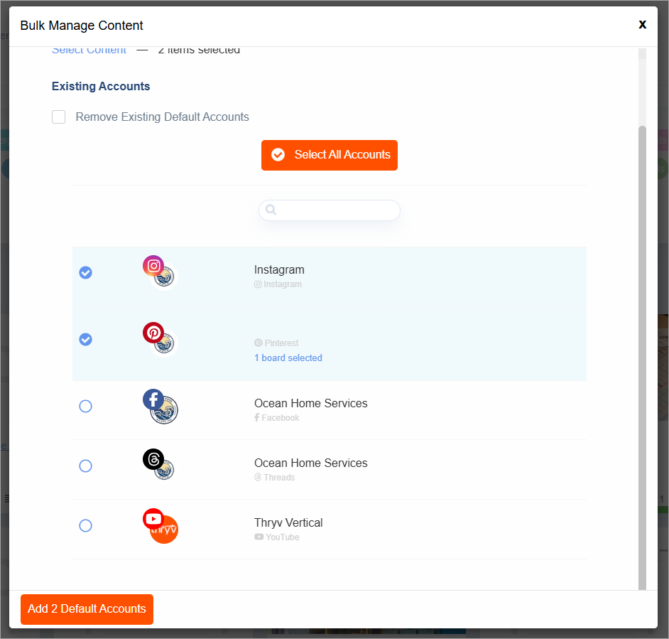 Select the appropriate default accounts then click Add Default Account. All of the content selected should now auto-fill into your schedule!