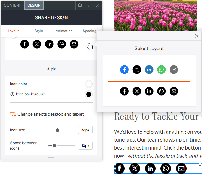 3. Using the design editor, select the layout and customize the icon colors, sizes and background. Choose hover effects for desktop and customize the title font and style.