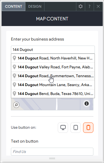 If your address does not show up in the drop-down, it means we are unable to find it in MapBox's API (sometimes different than their maps search). To get around this problem, try linking a Button widget directly to the map URL in Google Maps instead. If your address is missing from MapBox, you can send a request directly to MapBox to add your address.