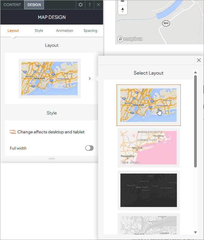 Open the Design Editor by clicking the design tab on the top left corner to change the map layout, style, animation, and spacing. Edit the design of the map that appears on your website using the layout section. Make changes to the width and height as well as change border styles in the style section. Customize the padding and margins (spacing around the widget) in the spacing section.