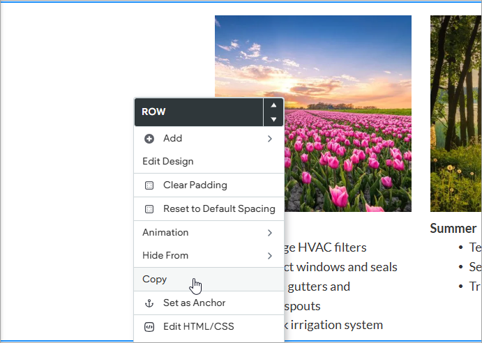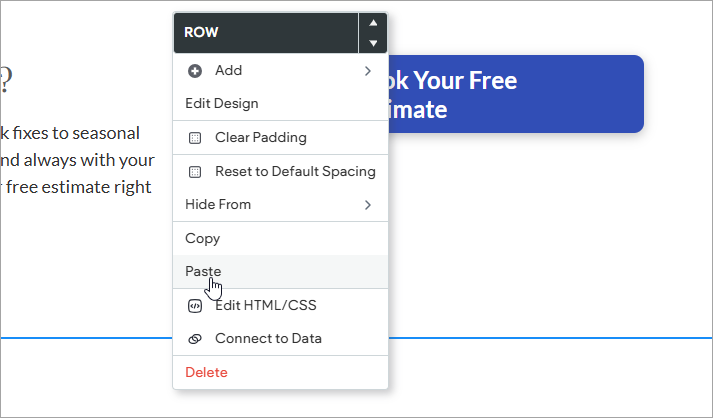 Open the Row menu to paste the column into a row. You can paste the column into any row on your site, including the header or footer. Please be advised that you can only paste up to four columns into any one row.