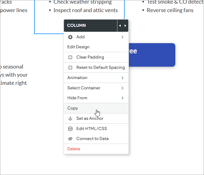 To copy and paste a column, right-click to open the column widget menu and select Copy.