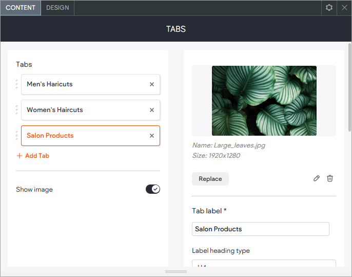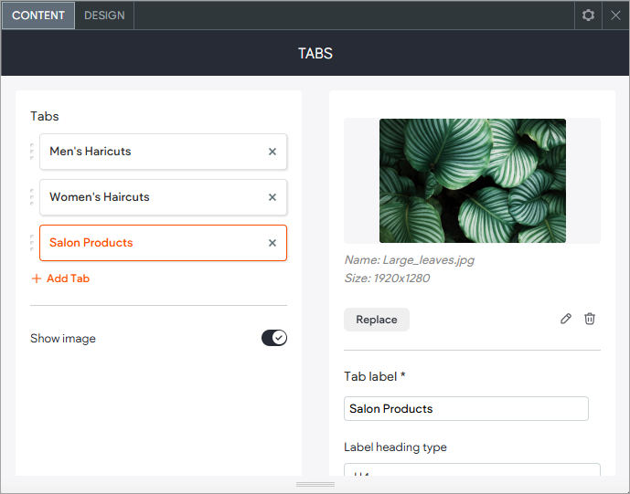 - From here, you can add or remove tabs and switch their order. You can edit the tab label, title, description, image and button.