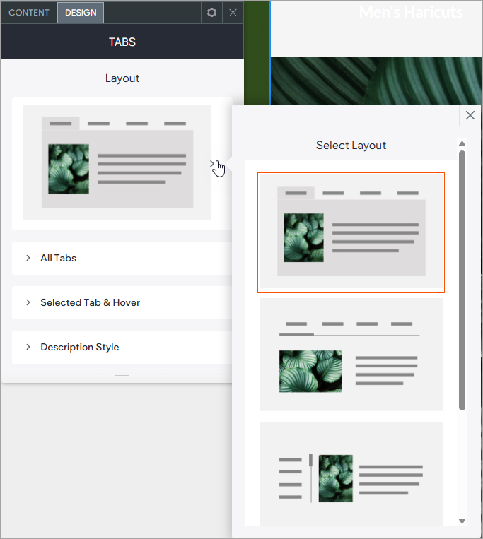 - In the design editor, you can choose from several pre-designed layouts, and customize the style of the tabs. Click All Tabs to customize the style of unselected tabs, reverse the tab direction, and control the tab layout on mobile. Click Selected Tab & Hover to customize the text style and background. Controllers for the text style, button style and image style are here too.