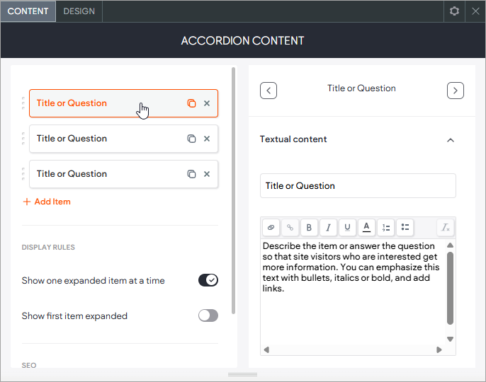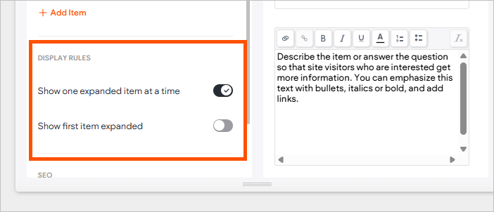 In addition, you may choose whether visitors can expand only one item at a time or can view several expanded items at the same time.
