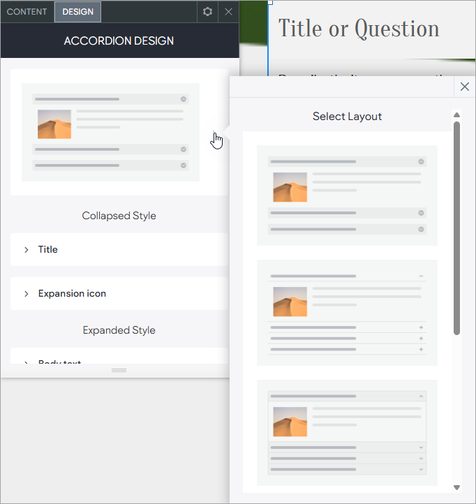 - The design editing menu lets you control the layout and styling of the accordion widget.