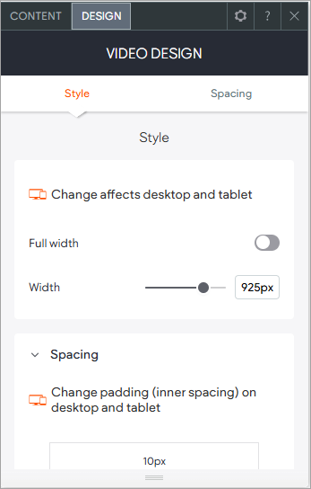 - Spacing - changes the spacing of the video player. Click on the area you want to add space to and change the number or use the slider bar.