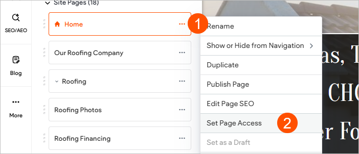- Click the more actions button on a specific page you want to protect and choose Set Page Access
