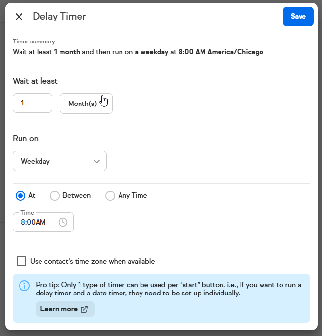 Pro-Tip! You can override the default time zone with the time zone of the contact record so that your emails send at the most appropriate time for their time zone.