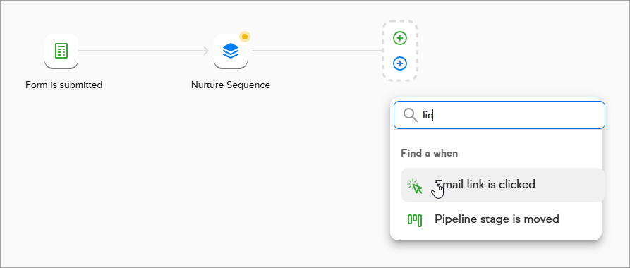 - Add an Email Link clicked item onto the canvas to the right of the sequence containing the email