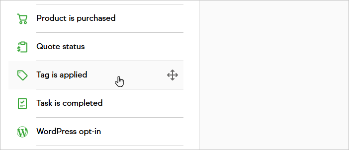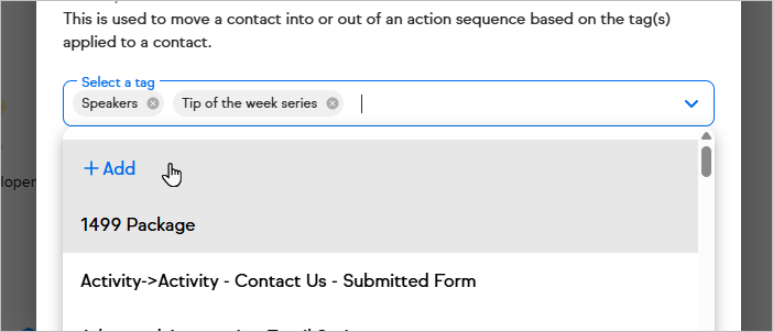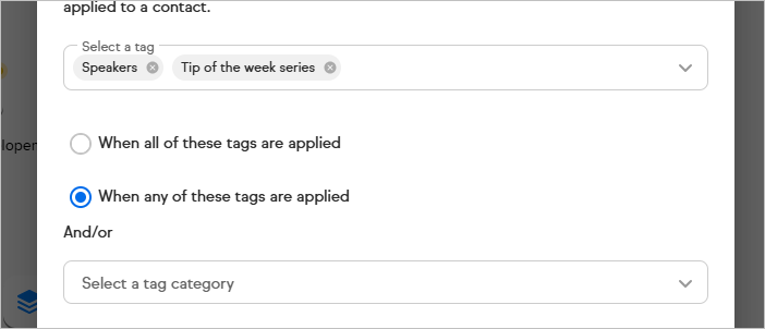 - Choose which tags or tag categories satisfy the goal and move the contact onto the next sequence. If you select more than one tag, you may choose to trigger the goal when any individual tag from the list is applied to a contact or when all of the tags have been applied to a contact.