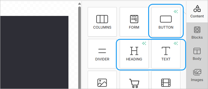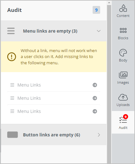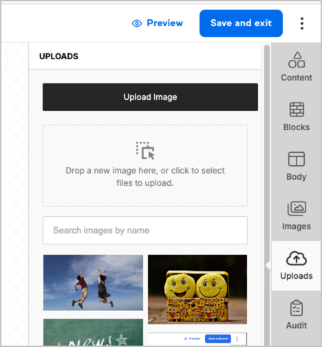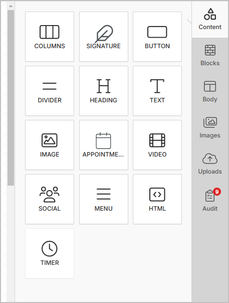The side panel in the editor consists of various tabs such as Content, Blocks, Body, Images, Uploads, and Audit. Each tab provides access to the unique functions of the editor.