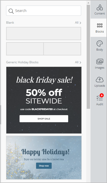 The Audit tab flags common issues to address before finishing your email. It currently looks for accessibility checks so you can identify and fix common issues during the design process. It addresses: