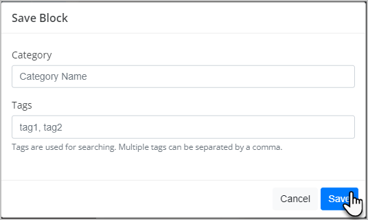Once you click save, you will be asked for a Category Name and optional Tags. This helps organize the blocks and make them searchable.