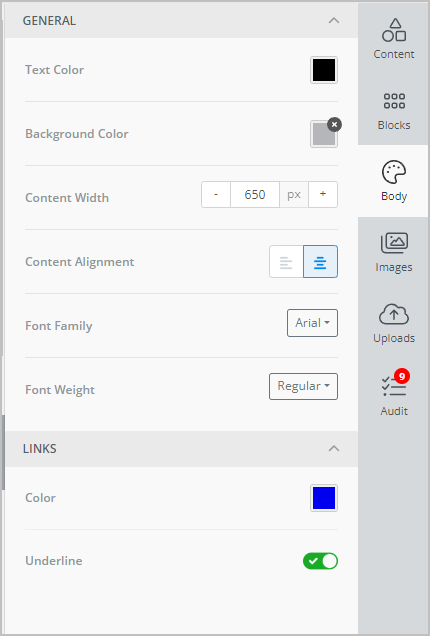 The Body tab allows you to style various email attributes as global settings. Any changes made here will apply to all elements in your email.