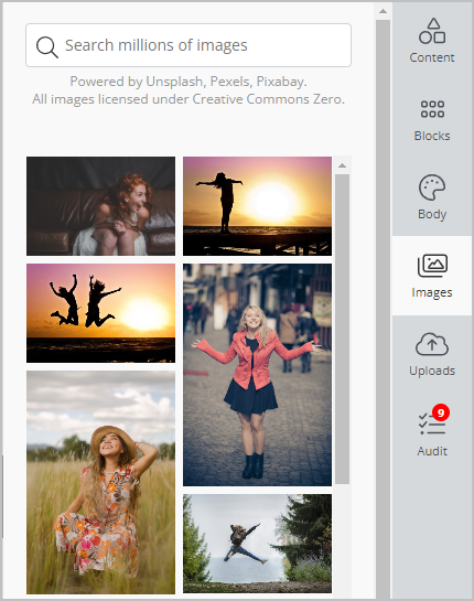 Images are an important part of designing an email or a landing page. This tab allows you to search a stock image library with millions of royalty-free images from Unsplash, Pexel, and Pixabay and add them to your design.