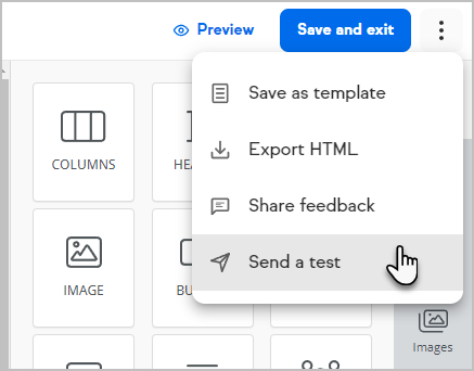 Click the Send a test button inside the 3 dots menu to send a test email, or click the Preview button to see how the email will look in most email clients and mobile devices.