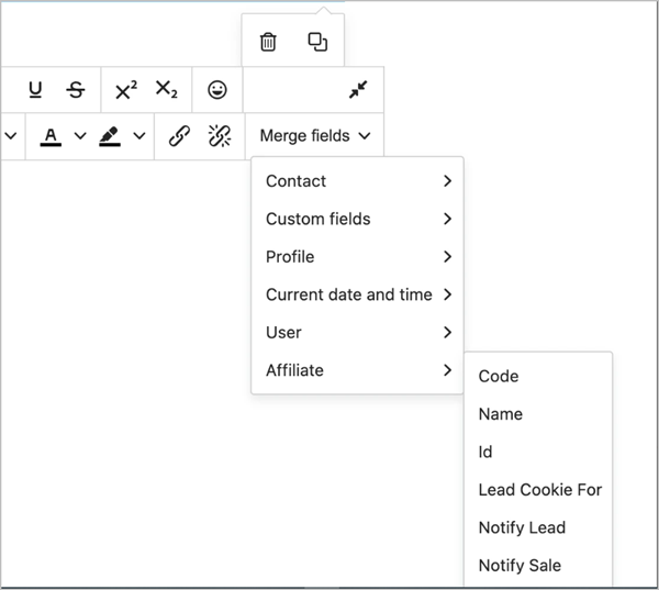 Note that the affiliate password is not available to be merged. Once the new Affiliate program is released, the Affiliate Password merge field will no longer be necessary.