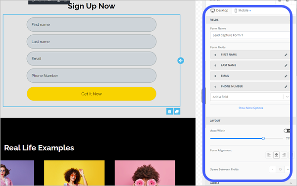 In the panel on the right-side of the page, you can configure the fields and the look and feel of the form.