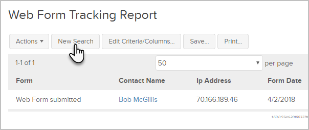 The Web Form Tracking report shows the contacts that are filling out your online web forms. Click the New Search button to filter by a specific web form, date submitted, or other criteria available.