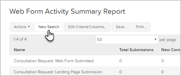 The Web Form Activity Summary Report shows detailed activity information about your online web forms. It tells you how many submissions came through a specific web form within a date range. Click the New Search button and you can filter by web form name and a form submission date range. Note that the date range for this report defaults to the last 30 days. You are able to customize the date range.