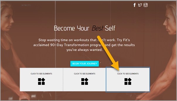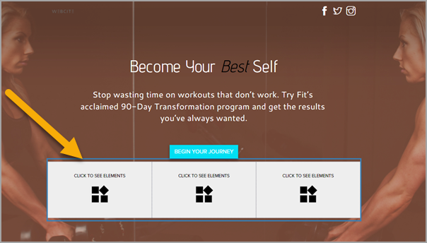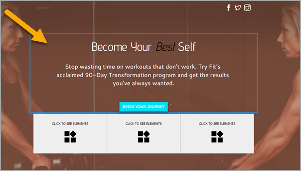 Row - A horizontal layout element. You can add multiple rows in a section. The hero section below contains 3 rows: The top row shows the social media icons (in the top right), the Hero text is currently highlighted in the middle, and there is a new row at the bottom that hasn't been configured yet.