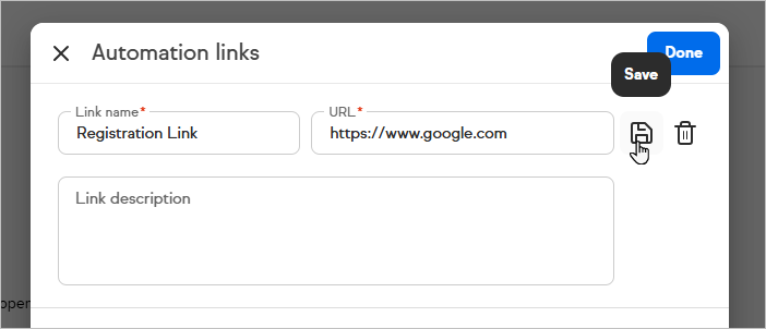- Enter the link Name, URL and (optional) Description and click Save