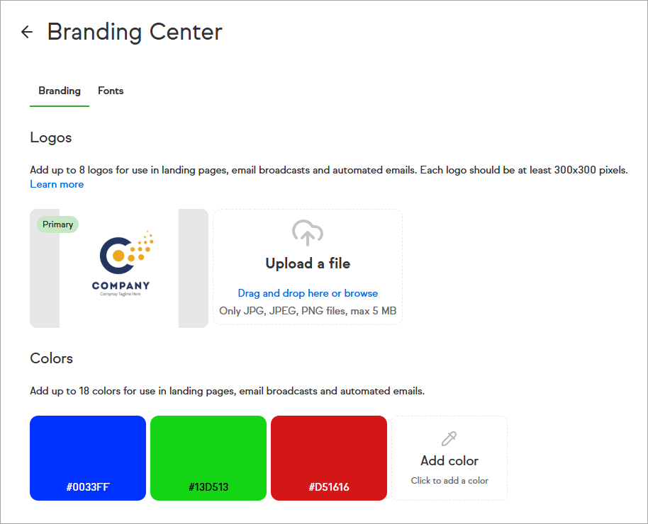 The Branding Center gives you a central place in Settings to add your default business logo and colors for your landing pages and emails.