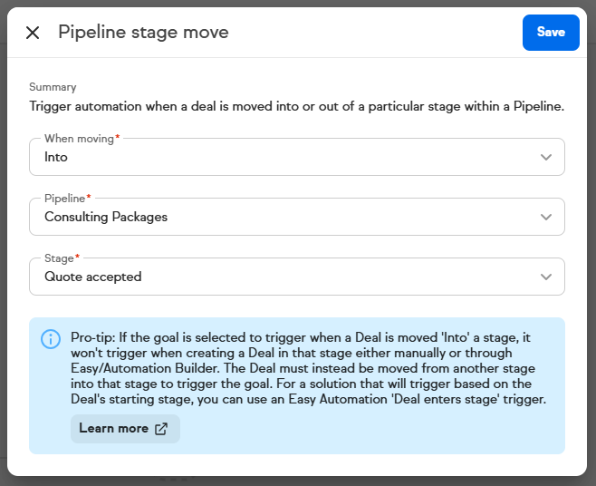 Pro-Tip: If the goal is selected to trigger when a Deal is moved ‘Into’ a stage, it won’t trigger when creating a Deal in that stage either manually or through Easy/Advanced automation. The Deal must instead be moved from another stage into that stage to trigger the goal. For a solution that will trigger based on the Deal's starting stage, you can use an Easy Automation 'Deal enters stage' trigger.