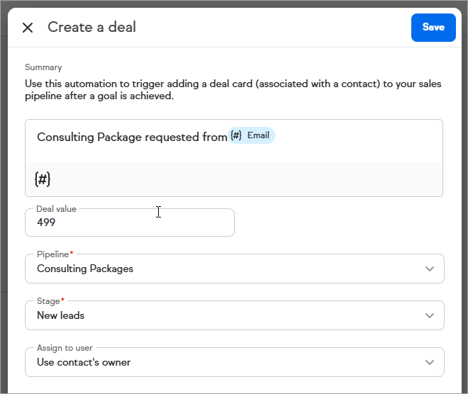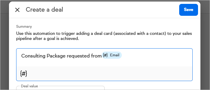 - Add a Deal name. This will be visible on your card in the Pipeline. Note that you can add merge fields from the contact record in the deal name