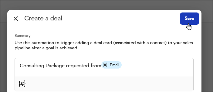 You can use the Create a Deal automation to trigger adding a deal card to your sales pipeline after a goal is achieved.