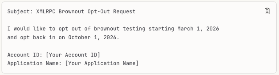 Brownouts are scheduled temporary outages designed to help you identify which of your systems still depend on XMLRPC. While we strongly recommend participating, you can opt out if you need uninterrupted service during your migration.