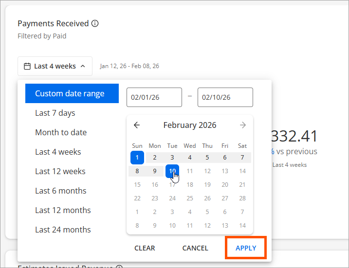 When Custom Date Range is selected, the date picker will appear. First, click on the start date for your custom range. Then, click on the end date. All days in between will be shaded to indicate they are part of the custom range. Click Apply to save your custom date range setting