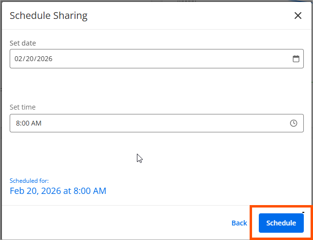 Finally, to send the report right away, click on Share Now. To schedule it for later, click on Schedule. Set a date and time, then click on Schedule.