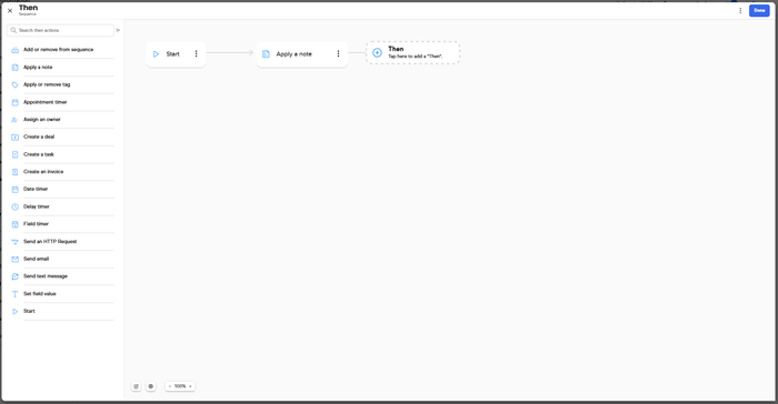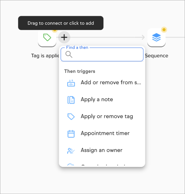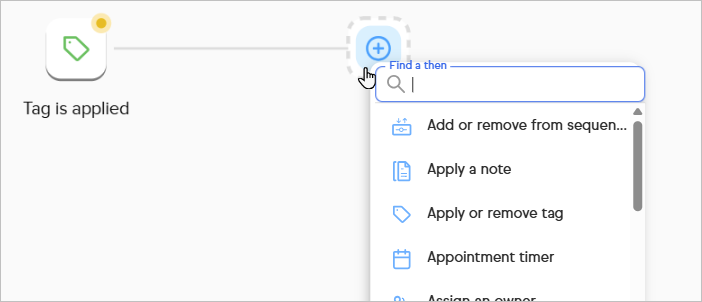 Upon clicking the +, another menu will drop down containing all the When or Then options for that sequence. You can search for these Whens or Thens.