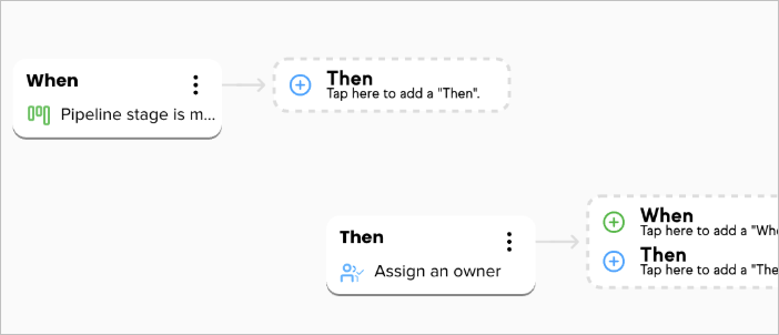 As you can see below, by using inline add you can add Whens or Thens directly within the context of the automation you are building, instead of pulling them from the side menu. Simply click on the + button and select the When or Then you would like to add next. There is no more wondering if a When or a Then can go after your previously selected element. For example, after the When below you can only add a Then, so you only have the blue Then option after the green When.