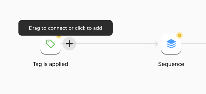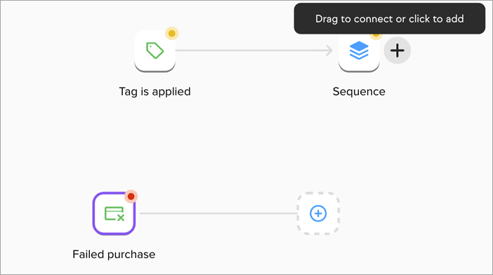 You may not see the add inline extension on every single element on the canvas, but this doesn’t mean you can’t use inline add on each element. For example, let’s look at the images below. In the first image, you are only seeing one + extended off the side of an element. The Failed Purchase When is the most recent element I pulled onto the canvas, which is why it has the add inline menu present. However, if I wanted to then add inline on the Sequence above, I would need to simply hover over the Sequence icon to have a + animation appear.