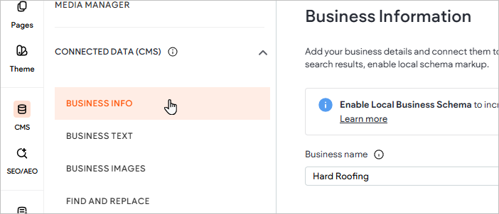 - Now click on Connected Data (CMS) > Business Info